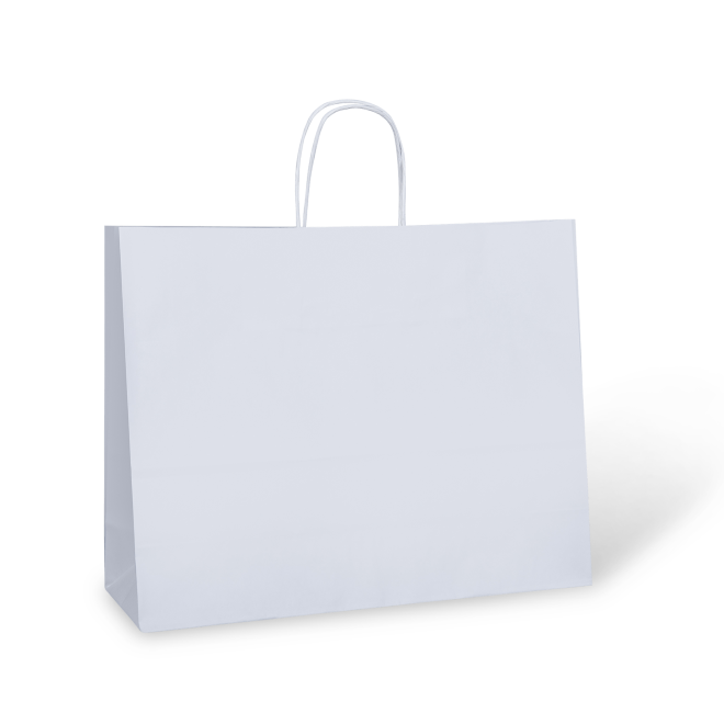White kraft paper twist handle bags are recyclable, compostable and reuseable. Ideal for retail and market stalls.