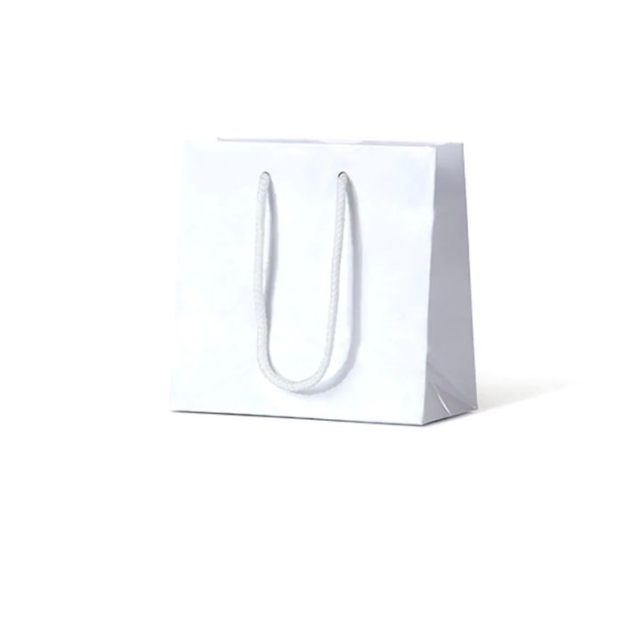 White Matte laminated paper bag with rope handle. Ideal for dress shops or for where a special bag is required.