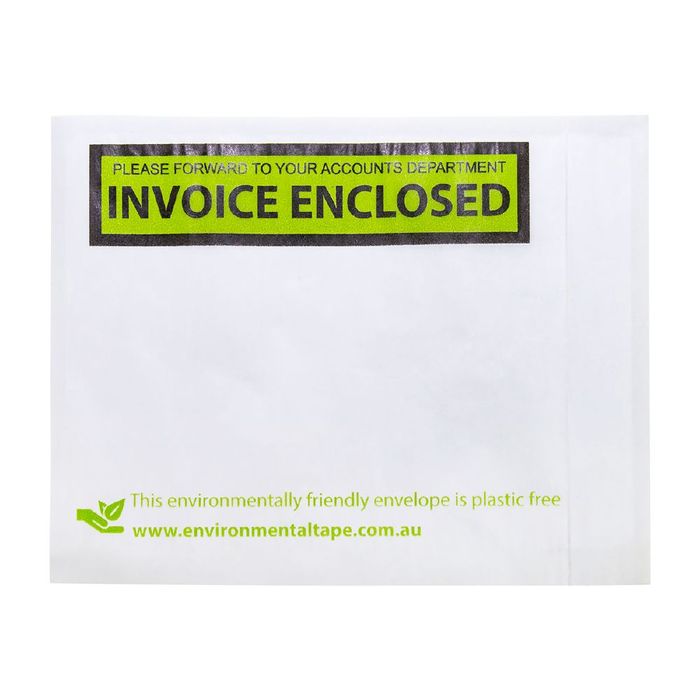Back: Clean white backing with a prominent lime green box printed with “Invoice Enclosed” for quick identification.