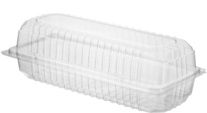 Hinged clamshell container, ideal for rolls, subs, or long sandwiches. Perfect for takeaway, retail, and food service use.